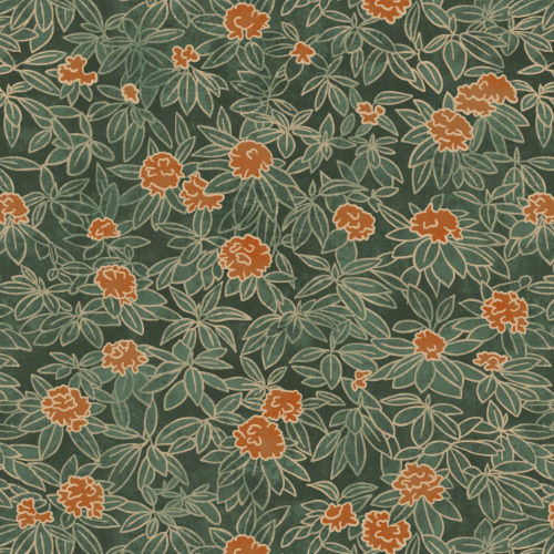 A continuous floral pattern of hand-drawn rhododendrons and leaves. Moody autumn hues make this design a versatile, rustic addition to the Mountain Flora and Fauna collection.